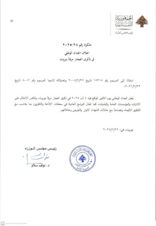 مذكرة رقم 28/2025 اعلان الحداد الوطني في ذكرى انفجار مرفأ بيروت