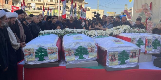 واحتشد الأهالي في “ساحة العلم” ببنت جبيل، فضلاً عن حضور عدد من الفاعليات السياسية والأهلية والبلدية، وقد لُفّت النعوش الخمس بالأعلام اللبنانية.