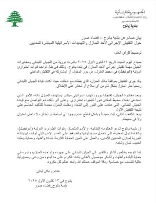 وبعد مغادرة الجيش، تفاجأنا بورود تهديد إسرائيلي مباشر يستهدف المنزل ذاته، الأمر الذي استدعى إخلاء محيط المكان فوراً كإجراء احترازي. وعلى أثر ذلك، تم التواصل مع قيادة الجيش اللبناني، التي عادت على الفور إلى البلدة، ودخلت المنزل مجدداً للتأكيد الحاسم على نتيجة التفتيش الأول.