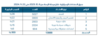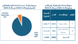 خلال جبهة الإسناد اللبنانية الممتدة من 8 تشرين الأول / أكتوبر 2023 إلى 22 أيلول/ سبتمبر 2024، سجّلت “إسرائيل” 13888 اعتداءً على لبنان، من بينها جريمة تفجير البيجر وأجهزة الاتصال يومي 17 و18 أيلول/سبتمبر 2024، كما بلغ عدد الغارات 2933 غارة، فيما تصدّر تصنيف “القصف” الرقم الأعلى ضمن الاعتداءات خلال الفترة المرصودة بـ5027 عملية قصف.