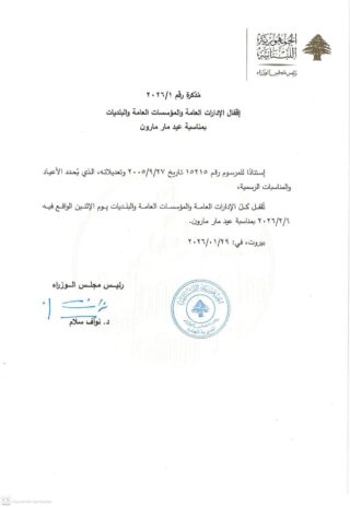 مذكرة إدارية رقم 2026/1 إقفال الإدارات والمؤسسات العامة والبلديات بمناسبة عيد مار مارون.