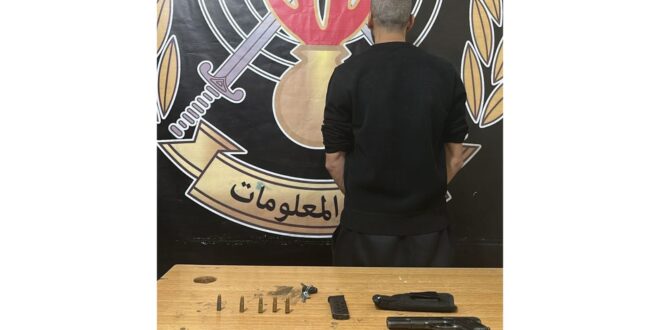 وبتفتيشه والدراجة، ضبطت بحوزته: مسدس حربي مع ممشط و5 طلقات صالحة للاستعمال.